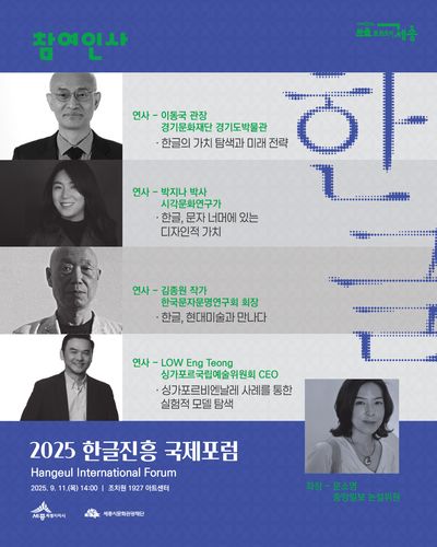 2부 종합토론에서는 이유미 한국전통문화대학교 초빙교수, 최두수 전 광주비엔날레 전시부장, 정혜욱 홍익대학교 교수가 ‘2027 한글 비엔날레, 어떻게 다르게 만들 것인가?’를 주제로 논의를 이어간다. 토론 좌장은 문소영 중앙일보 논설위원이 맡아 국내외 전문가들의 심도 있는 의견을 이끌어낼 예정이다.