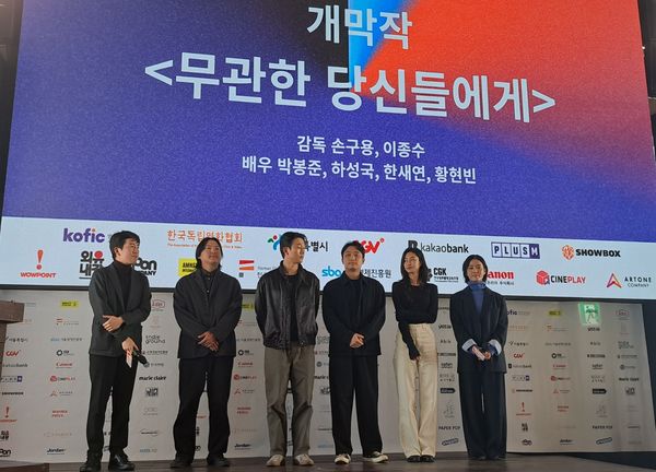 공식 기자회견의 마지막 순서로 개막작 <무관한 당신들에게>의 손구용·이종수 감독과 박봉준·하성국·한새연·황현빈 배우가 참석해 영화에 대한 소개와 더불어 개막작으로 선정된데 대해 소감을 발표했다. 영화평론가 문주화의 기획으로, 네 명의 영화감독이 참여한 <무관한 당신들에게>는 박남옥 감독의 <미망인>(1955)을 상상적으로 복원하고 새롭게 써 내려간 작품이다. 전시로 먼저 선보인 이 프로젝트는 서울독립영화제를 통해 재해석된 ‘각자의 <미망인>’을 스크린 위에 다시 올리며, 과거의 영화가 아닌 동시대의 영화로 재탄생시키는 특별한 영화적 체험을 가능케 할 것이다.
